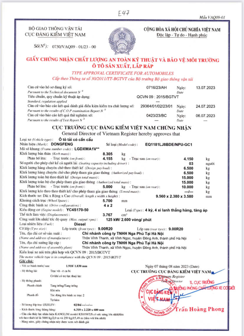 | Kích thước lòng thùng | 6150 x 2230 x 600 mm |